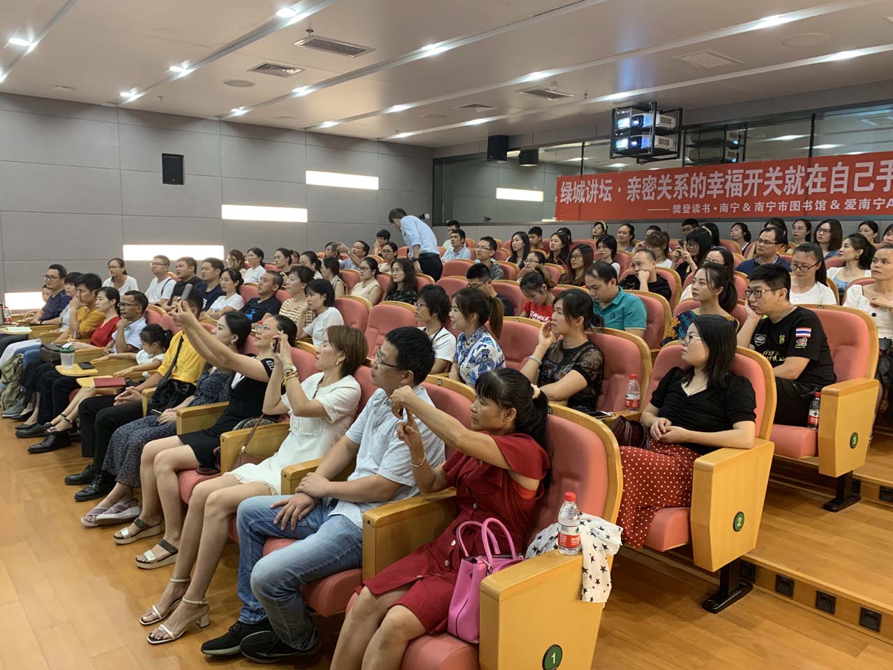 “他变了,没有以前那样体贴!”“凭什么每天都是我洗碗?”“说了你这么多次,你怎么都不改?!” 这些对话大家熟悉吗?是否曾经和最爱的人有过如此争执呢?在爱与被爱的过程中,大家都曾经历过痛苦、恐惧,也体验过狂喜与极乐,大家都渴望建立真挚的亲密关系,却又害怕再度受伤。南宁市图书馆为了使南宁市民从书籍中广泛汲取营养,开阔视野,从而提升市民对亲密关系的认识,促进和谐社会的发展,于8月10日上午联合樊登读书会共同举办了“我和我的祖国——共建和谐家庭·培养亲密关系”阅读专题讲座。