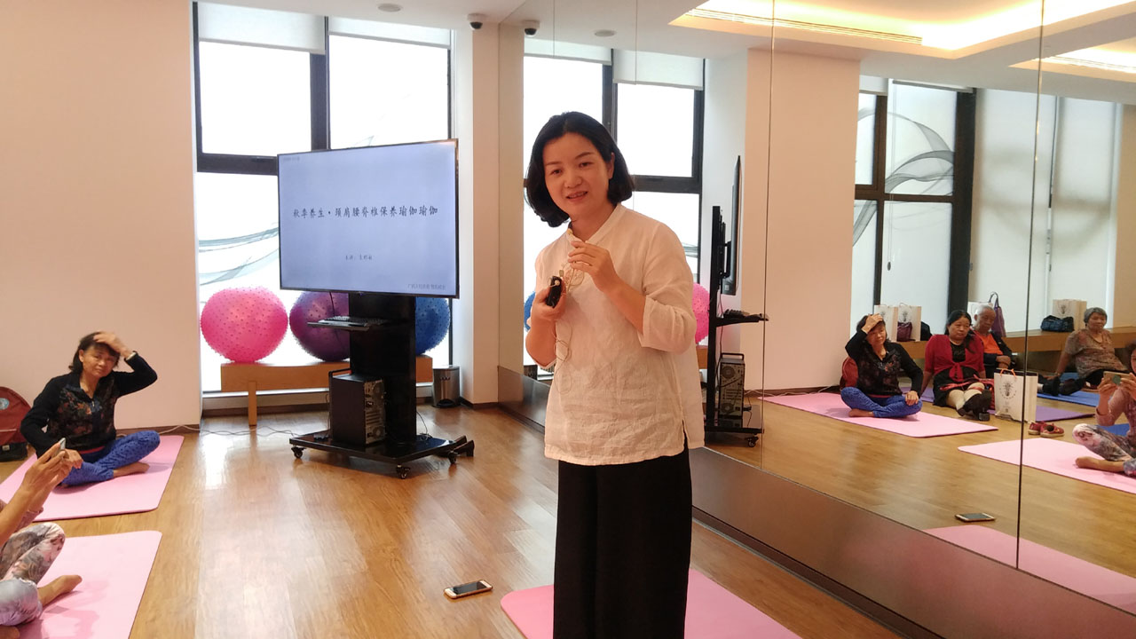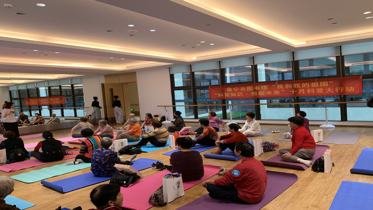 现在正值秋高气爽的好时节,为贯彻落实《“健康中国2030”规划纲要》,推进健康中国建设,提高人民健康水平,使绿城读者以更强健的体魄遨游书海,也为提高绿城读者的科学素质,增强读者获取和运用科技知识的能力、改善生活质量、实现身心全面发展,南宁市图书馆在2019年10月26日下午走进华润悦年华颐养社区,为社区的中老年读者朋友们送上了一场别开生面“我和我的祖国”——秋季养生·颈肩腰脊椎保养瑜伽科普讲座。
