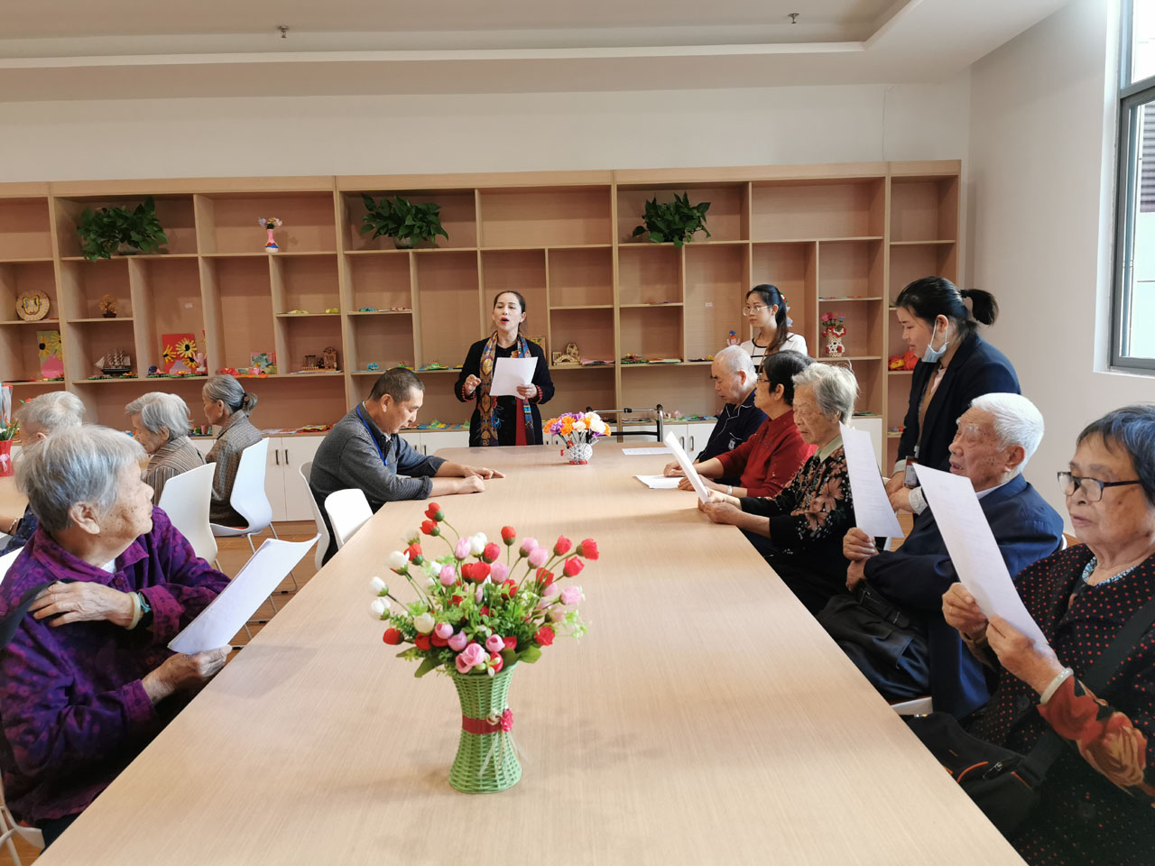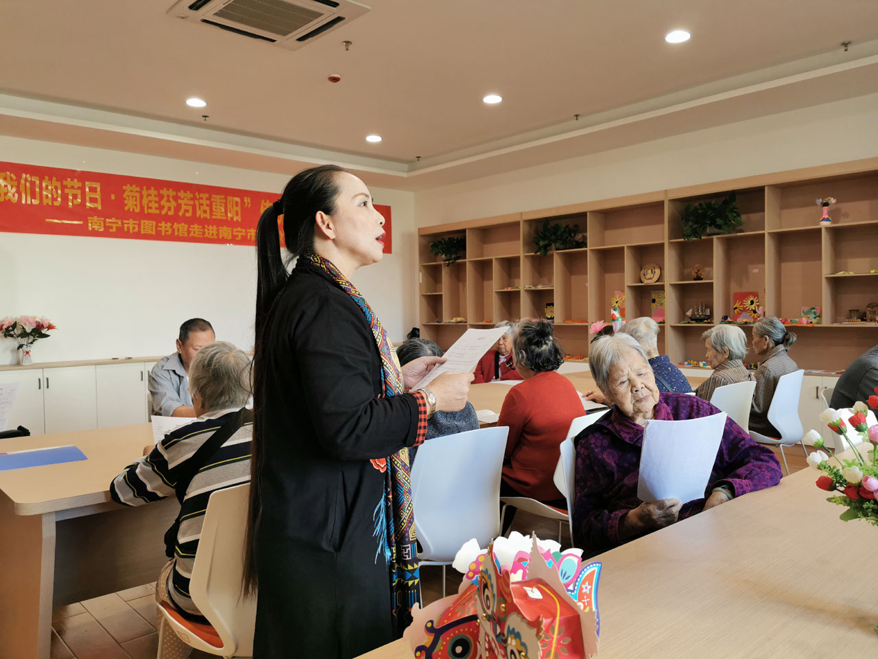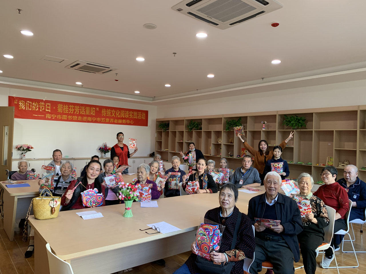 金秋十月爽,九九话重阳。百善孝为先——为弘扬中华民族尊老、敬老、爱老、助老的传统美德,营造良好的尊敬老人的社会氛围,迎合老年读者的精神文化需求,南宁市图书馆在这个菊桂飘香的美好季节里,于2020年10月23日下午走进南宁市五象养老服务中心,为那里的老年读者们举办了“我们的节日·菊桂芬芳话重阳”传统文化阅读活动。