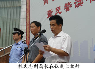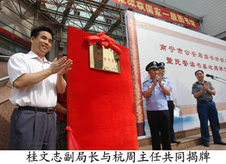 南宁市文化新闻出版局副局长桂文志、南宁市公安局党委委员、政治部主任杭周出席了活动并分别致辞,共同为南宁市公安局“民警读书基地”揭牌。希望借此活动开展创建“学习型警营”、大力营造“全民阅读”的良好氛围。随着“南宁市公安局‘民警读书基地’”的牌匾被徐徐揭开,南宁市公安局的读书活动正式启动。
