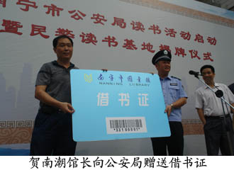 为了给南宁市公安局的民警提供更良好、更方便的读书场所,使民警能充分利用我市的藏书资源,南宁市图书馆党支部书记、馆长贺南潮代表图书馆向南宁市公安局的民警免费赠送了6000张图书借书证。使每一位民警都能持借书证在南宁市图书馆及六城区的图书馆借阅图书。这是继南宁市图书馆免费为残疾人办理图书借书证之后的又一重大优惠举措,体现了南宁市文化新闻出版局、南宁市图书馆在更好地构建南宁市公共图书馆服务体系,为全社会提供普遍、均等、优质的文化服务方面,更上了一个新的台阶。