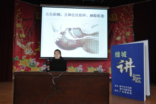 为提高南宁市图书馆全体干部职工的健康意识,提升总体健康水平,2011年1月21日上午,南宁市图书馆邀请了广西科教健康宣讲工作服务中心的工作人员在多功能厅举办了“紧急救护、健康知识”职工技能培训讲座。