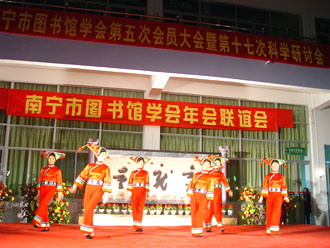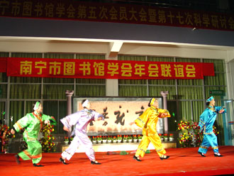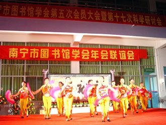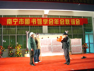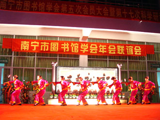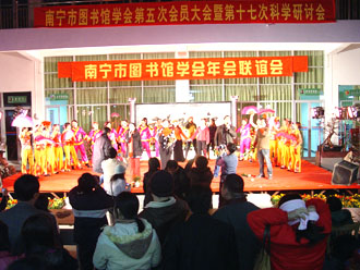 风寒人心暖 共聚图书缘 ——记2005年南宁市图书馆学会年会联谊晚会 金鸡展翅飞,玉犬迎新岁。元月6日晚,来自六县六城区以及南宁市属公共图书馆、学校系统、卫生系统、厂矿系统图书馆界的近两百位南宁市图书馆学会会员在元旦刚刚开馆的横县端书图书馆内欢聚一堂,共同欣赏南宁市图书馆学会年会联谊晚会的精彩节目,南宁市科学技术协会盘承新副主席、南宁市文化局鲁利副局长和南宁市科协学会部刘娟部长等也应邀观看了晚会。 端书图书馆一曲欢快的开场舞蹈《喜气洋洋》唱响了新年的喜悦,跳热了南宁市图书馆的事业。晚会上,南宁市科学技术协会盘承新副主席和南宁市文化局鲁利副局长作了新年致辞,他们希望图书馆学会充分发挥自身优势,不断壮大学会队伍!并祝福会员们在新的一年里工作更上一层楼!生活越过越幸福!刚被推选为南宁市图书馆学会第五届理事会理事长的南宁市图书馆莫萍馆长与各兄弟馆代表在台上排成长龙,共祝大家新年快乐,心想事成! 晚会虽然是在露天的环境中进行,但3℃的低温天气阻止不了台上欢歌笑舞,台下欢声笑语。春寒料峭,冷风习习,演员们大多身着单薄的演出服,但这并不影响大家的表演兴致,无论是唱歌跳舞演小品,还是朗诵快板小游戏,他们都挥洒自如,表现得淋漓尽致。青秀区的独唱《踏浪》轻快可人、市一中的诗歌朗诵《梦想》独具特色、上林县图书馆的快板《四老太赶街》韵味十足、邕宁区图书馆的独舞《天山情》柔情妩媚,市图书馆的舞蹈《俏夕阳》以其诙谐的音乐和幽默的舞姿更是把晚会推向了高潮……最后,市图书馆全维明、贺定龙、方静和张艳红以一曲合唱《今夜无眠》为晚会画了一个圆满的句号。 南宁市图书馆学会年会和联谊会的成功举办离不开社会各界同仁的大力支持——南宁市科学技术学会和广西图书馆为此提供了大量的活动经费,横县图书馆和横县歌舞团也为此支持了诸多会务工作,正可谓风寒人心暖,共聚图书缘。在此值得一提的是,会务组的工作人员邵高宁、农道芬等同志提前三天就从南宁赶到横县,他们克服不利条件、顶住骤然变冷的天气,做了大量的筹备工作,充分体现了图书馆人坚忍不拔的团队精神。 2006年元月6日是难忘的,在鸡岁已登千仞塔之时,南宁市图书馆人将展望未来,一如既往,为文化大南宁作出更大的贡献! 相关图片: