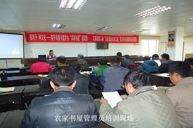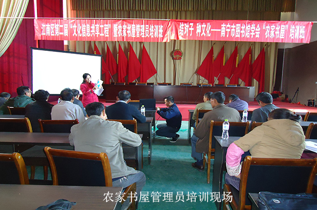 为深入贯彻中共南宁市委宣传、南宁市文化新闻出版广电局、南宁市文学艺术联合合《关于在全市文艺界广泛开展“深入生活、扎根人民”主题实践活动的意见》,南宁市图书馆学会联合市、县区图书馆积极开展全国文化信息共享工程暨农家书屋管理员培训班,11月-12月已分别在良庆区、江南区举办四期讲座,共计120多管理员参加培训班的学习。