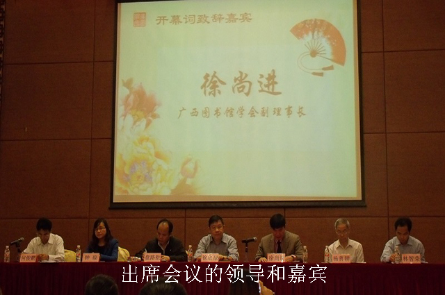 开幕式由来宾市图书馆馆长何俊鹏主持,广西图书馆学会副理事长、广西大学图书馆馆长徐尚进致开幕词,来宾市文化新闻出版广电局副局长盘路航致欢迎词。