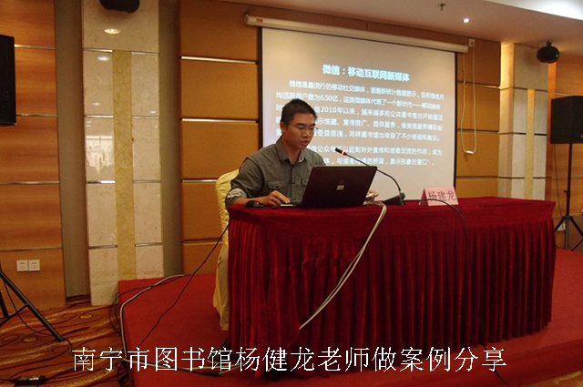 当天下午的科学讨论会采用案例分享的方式,在“少儿阅读推广服务”和“新媒体阅读推广”两个分会场同时进行。在“新媒体阅读推广”分会场上,南宁市图书馆《微信与图书馆服务创新》案例引起了评委和与会代表们的浓厚兴趣,现场气氛热烈。最终,该案例获得本次年会优秀活动案例二等奖。在随后的闭幕式中,我馆技术部杨健龙同志代表上台领取奖牌。