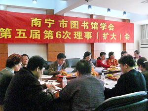 南宁市图书馆学会第五届第六次理事(扩大)会议于2007年3月20日在痊于大沙田的广西听涛文化发展有限公司召开,17位理事及六县六城区图书馆馆长