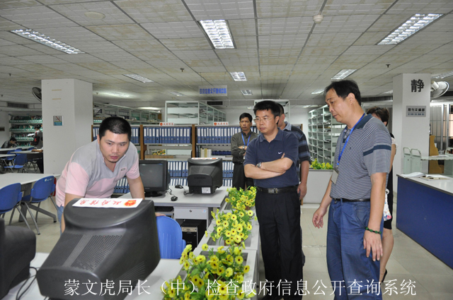 蒙局长实地考察了我馆市民阅读中心、文学借阅室、特色藏书阅览室、电子阅览室、等开放窗口,重点视察了我馆链接的政府信息公开查询系统和我馆负责维护管理的南宁文化信息网的运作情况,对我馆在网络资源建设中作出的努力表示充分肯定,并对我馆网站建设提出指导意见。他说,公共电子阅览室的建设是构建公共文化服务体系的新平台、新渠道和新举措,是维护未成年人文化权益的重要手段,是推进全社会信息化建设的重要途径,我们要坚持建设与管理并重;同时,要充分发挥我们作为公共文化信息服务工作宣传部门的职能作用,完善技术平台,加强服务,确保文化信息工作积极、稳妥地开展。