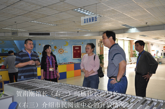 贺南潮馆长向杨局长汇报了我馆在公共文化服务工作进展、服务特色、取得成绩等情况,分析了迎接免费开放可能面对的问题,并对我馆应对免费开放的具体实施方案和“十二五”发展规划进行详细介绍。