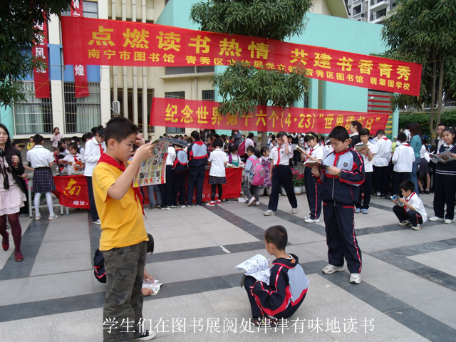 翡翠园学校依傍风景秀丽的青秀山,是凤岭新区第一所现代化的九年制公办学校,具有浓厚的阅读氛围和求知环境。当天,南宁市图书馆向该校赠送了200多本课外读物,受到学生们的热烈欢迎。在一个多小时的图书展阅中,数百名中、小学生纷纷抢阅他们喜爱的图书,或站在展览桌前,或在校园里席地而坐,津津有味的阅读起来。而有奖知识竞答的现场则更是热闹非凡,南宁市图书馆挂出的一百多条“喜迎建党90周年——党建知识有奖竞答题”以及“有奖猜谜”在几分钟内就被学生们抢答一空,争相拿着题目去兑奖,令我们的工作人员都应接不暇。此外,在签名立志的活动中,学生们纷纷在印着“让书香溢满青秀、让心灵徜徉书海”的横幅上签下自己的名字,并立下读书明志的远大志向。看到学生们好求知、爱读书的热情,我们深感赠书活动的价值。在活动现场,我们还将“南宁市图书馆简介”宣传折页发放给到场的家长,或通过学生带回给他们的家长,希望他们能到图书馆来享受更多的公益文化服务。
