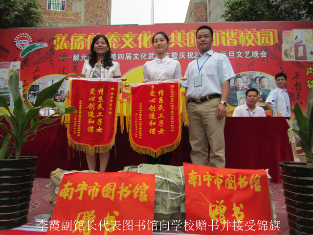 解元坡小学在晨会的时间举行了一个简单而隆重的赠书仪式,解元坡小学的姚副校长在会上致欢迎辞。南宁市图书馆李霞副馆长在会上向学生们呼吁,希望他们多读书、好读书、读好书,通过阅读打开视野,培养学习兴趣,并欢迎家长带孩子们到南宁市图书馆来接触更多的信息和知识。解元坡小学的一名学生代表上台声情并茂地诵读了一封感谢信,感谢社会各界对他们的关心和爱护,他们将更努力的学习,不辜负社会的期望。随后,南宁市图书馆李霞副馆长代表图书馆向解元坡小学赠送了爱心图书并接受了学校回赠的锦旗。
