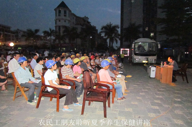 关爱农民工科学保健专题知识公益讲座于晚上七点整准时与广大农民工见面,应邀主讲的医学专家马标英老师为大家详细讲解了夏季养生保健的科学方法,并接受了农民工和居民们的现场咨询,进行了互动有礼活动。