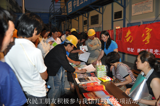 “南宁市农民工文化艺术节”自2005年开办以来,已经成为南宁市外来务工人员展示魅力、享受文化资源的文化盛典。作为南宁公共文化服务的中坚力量,南宁市市图书馆从2005年起一直致力于开展和打造“关爱农民工•知识送温暖”活动品牌。多年来,以别具匠心的策划、丰富的活动形式收到了较好的服务效果,极大促进了广大农民工朋友的读书热情。