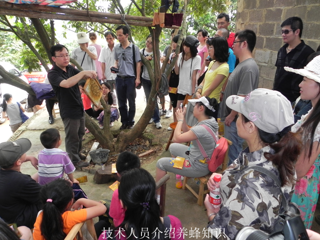 一到养蜂基地,孩子们的注意力就被一个个方形的蜂箱和旁边放置的一个大圆桶给吸引了。接着,养蜂场的技术专家从蜂箱里拿了一块蜂框为大家详细讲解了养蜂知识:蜜蜂的种类、分工、生长习性、不同的蜂巢以及怎样采集蜂蜜等等。在场的每一位成员都像听故事一样津津有味,还非常踊跃地向技术人员提问。技术专家幽默风趣的回答引得大家在会心一笑的同时对养蜂科技知识有了十分深刻而直观的印象。随后,技术人员向我们演示了采集蜂蜜的过程:先把蜂框上一层白色的结晶——蜂蜡铲掉,然后把蜂框放进大圆桶——分蜜机里,转动把手,机器利用离心力的原理,将蜂巢里储存的蜂蜜分离出来,经过过滤就成了天然可食用的美味蜂蜜了。孩子们对分蜜机充满好奇,纷纷体验了一回“摇”蜂蜜的乐趣。最让人紧张而期待的时刻,是技术专家带领我们下到一个小山谷里,看养蜂人挖野蜂窝。在这里我们见识了与养殖截然不同的纯白色的野生蜂巢以及蜂巢里比米粒更小的蜂卵,大家都觉得开阔了眼界,仿佛上了一堂生动而有趣的科普知识课。南宁市图书馆还给孩子们赠送了小笔记本,让他们边观察学习边做记录,提高作文写作的水平。