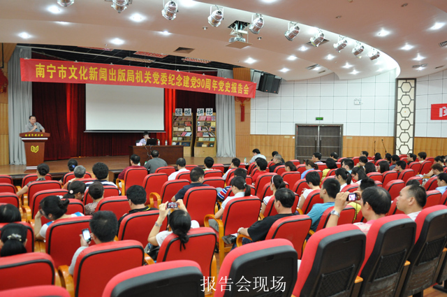 为纪念中国共产党建党90周年,2011年6月22日下午,南宁市文化新闻出版局机关党委组织全体党员干部在南宁市图书馆多功能厅召开了“纪念建党90周年党史报告会”。南宁市文化新闻出版局机关党委副书记葛爱平主持了报告会,局领导、全体党员、包括预备党员和入党积极分子在内的200多位听众认真聆听了由为南宁市文化新闻出版局副调研员李庄所作的党史报告。
