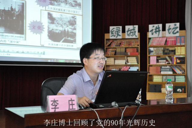 李庄博士在报告中将中国共产党90年的辉煌党史分为三个时期,以不同历史时期发生的重大党史事件为主线,着重从党领导的革命事业、社会主义建设事业和党的自身建设三个方面,回顾了中国共产党走过的90年辉煌历程;运用大量的图片和史实,深刻揭示了中国共产党在新民主主义革命时期、在社会主义革命和建设时期、在改革开放和中国特色的社会主义现代化建设新时期的探索和伟大成就。歌颂了建国以来特别是改革开放以来,在党的领导下,中国特色社会主义事业发展的丰硕成果;讴歌了中国共产党人不畏艰辛、奋力拼搏、开拓进取的优秀品质;传扬了老一辈革命家的优良传统。
