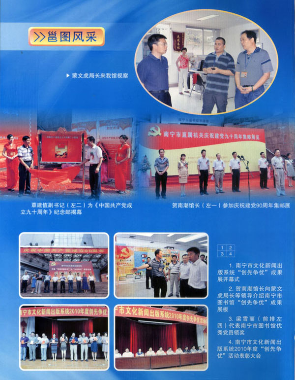 2011年6月16日上午,在庄严的国歌声中,由中共南宁市直属机关工作委员会、南宁市邮政局主办,南宁市直属机关工会工作委员会、南宁市图书馆、南宁市集邮协会承办的“南宁市直属机关庆祝建党90周年集邮展”于南宁市图书馆门前广场隆重拉开了帷幕。市政协副主席李勤、南宁市图书馆贺南潮馆长等领导出席了当天的开幕式。