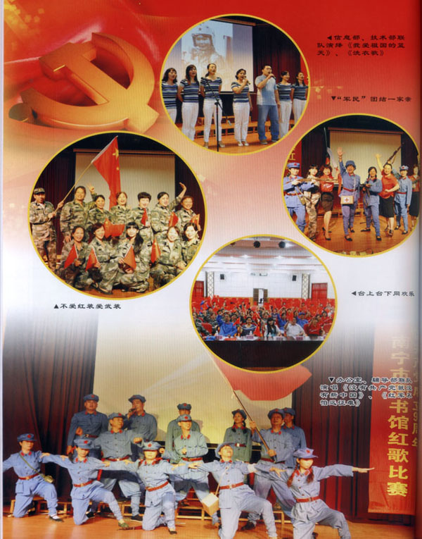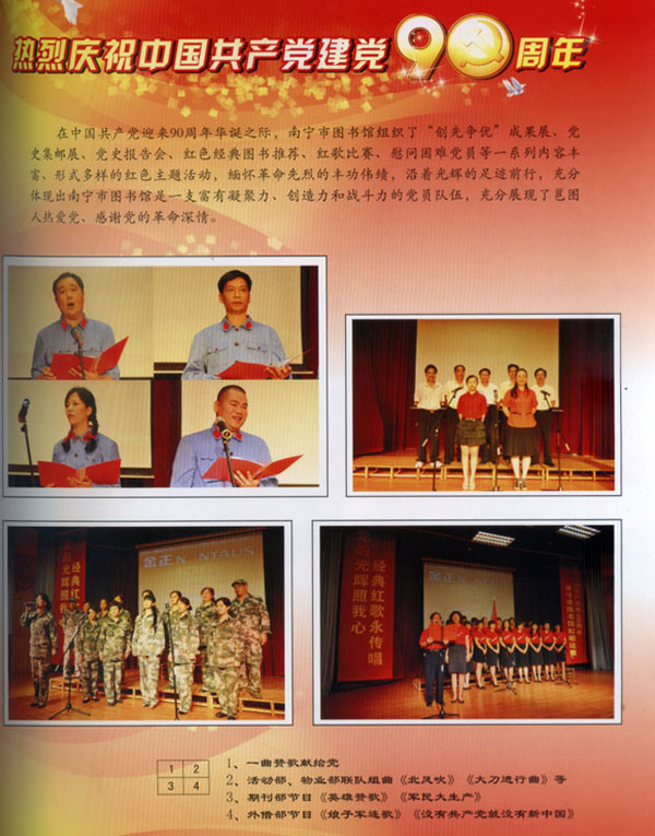 党的光辉照我心,经典红歌永传唱。南宁市图书馆人以积极向上的精神面貌、颂党恩、忆党情,为建党90周年献上了一份独特的厚礼。