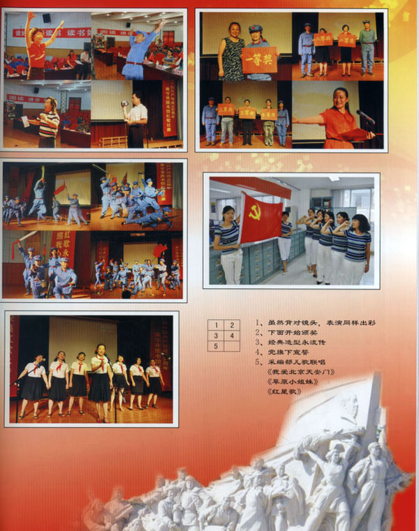 令人紧张而激动的颁奖典礼随后到来,经过评委公平、公正、公开的评分,期刊队、信息技术联队和活动物业联队分别荣获三等奖,获得二等奖的是采编队和外借队,办公室联队不负众望地摘取了一等奖桂冠。比赛的最后,全体人员上台齐声合唱《没有共产党就没有新中国》。