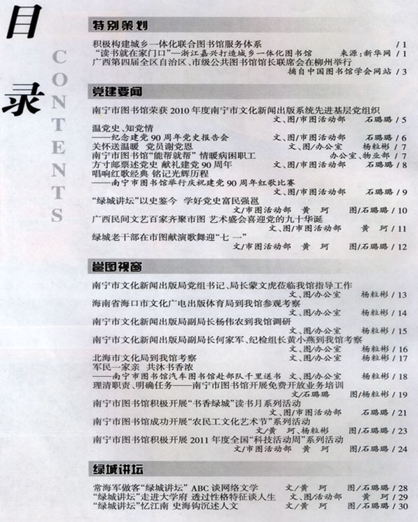 今年4月份以来,我们紧紧围绕“提升服务,文化惠民”的主题,以“书香绿城”读书月、农民工文化艺术节、图书馆服务宣传周、“科技宣传周”周等节庆节日为依托,开展了系列活动,使南宁市图书馆的社会文化服务之花香满绿城。