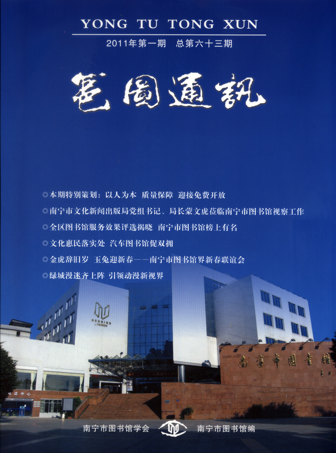 本期特别策划:迎接免费开放 【编者按:文化部、财政部日前出台的关于推进全国美术馆、公共图书馆、文化馆(站)免费开放工作的意见明确指出,2011年底之前全国所有公共图书馆实现无障碍、零门槛进入,公共空间设施场地全部免费开放,所提供的基本服务项目全部免费。社会各界的目光齐聚公共图书馆,南宁市图书馆为响应国家免费开放的决策,积极着手一系列准备工作,本期特别策划了免费开放工作的专题,为读者全程关注、详细解读免费开放进程。】