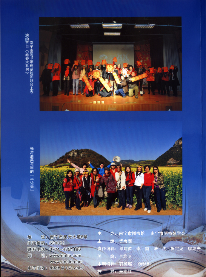 2011年,有很多事情需要我们去改变。我们要改变服务方式,迎接免费开放;改变服务手段,更新服务平台;改变服务质量,全心全意推进图书馆工作。这一路不会轻松,会有各种未知的艰难阻碍。希望全体同仁能将我们的理想、我们的热情、我们的智慧融入对图书馆服务阵地的坚守中,当图书馆事业花团锦簇的时候,我们每个邕图人的脸上也必将绽放烂漫娇红。