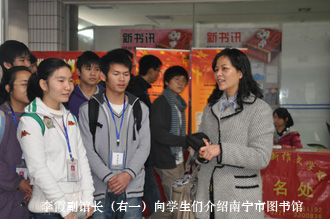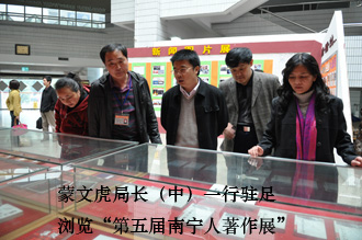 2011年3月4日下午,南宁市文化新闻出版局党组书记、局长蒙文虎、分管社文科的郑家海副局长及社文科科长杨伟农等一行莅临南宁市图书馆检查指导各项工作,南宁市图书馆馆长贺南潮、副馆长李霞、副馆长陆庆率图书馆员工热情接待。