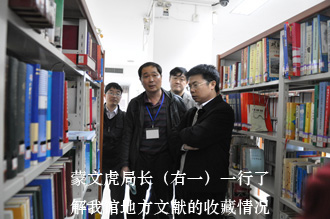此外,局领导一行还视察了采编部、活动部、信息部、技术部等部门,蒙局长和郑副局长非常关心的询问了各位同志的工作情况,贺南潮馆长也详细的向其一一做了介绍。视察过程中,贺南潮馆长、李霞副馆长、陆庆副馆长分别向局领导汇报了近期工作情况、实际遇到的困难及未来的发展规划,针对日前文化部、财政部共同出台的公共图书馆免费开放的具体实施方案、已经正式立项的南宁市中心图书馆项目建设过程中的问题以及“十二五”规划中的