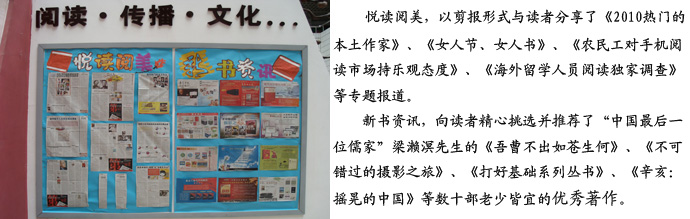 2010年,是横县图书馆新馆建成开放、端书图书馆成立的第五年。这五年,也是和我国国民经济和社会发展“十一五”规划建设同步发展的五年。五年来,在县委、县政府的正确领导,上级有关部门以及社会各界的关心和支持下,深入宣传贯彻党的十七大和十七届三中、四中、五中全会精神,围绕县委、县政府提出的社会发展工作目标,加强领导,加大投入,创新服务,依托公共文化体系图书馆的服务平台,充分发公共图书馆知识宝库,文化传播和社会教育等宣传作用,积极组织实施文化致富工程,使我县的图书馆事业实现年年有新发展,读者活动多元化持续开展、成绩裴然。2010年初获得了国家文化部授予的“一级图书馆”称号,2010年12月,又获得了“全国服务农民服务基层文化建设先进集体”荣誉,为丰富我县城乡群众文化生活,为建设广西强县、打造北部湾经济区新兴城市和实现我县文化建设大发展大繁荣做出了积极的贡献。