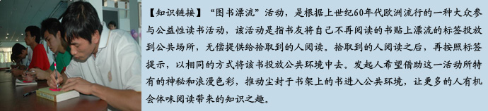 活动中,图书馆倡议广大师生通过捐书方式,将图书和爱心集中到图书馆的漂流书屋,所有来馆读者可以不需办理借阅手续,进行互相传阅,以在达到漂流的意义的同时让读者共享好书、传递经验、交流感情。此项活动不但有利于丰富、补充图书馆的馆藏,成为实现文献资源共享的一种新形式,而且有利于营造阅读氛围,倡导健康向上的学习风气。