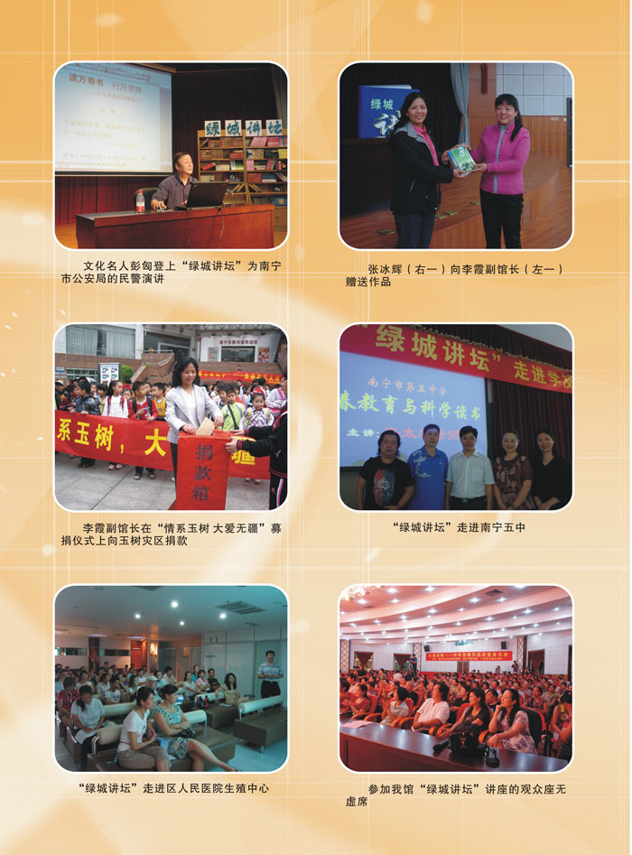 2006年,我馆创办“绿城讲坛”公益讲座,内容涵盖科学、文化、艺术等诸多领域,开办至今,共举办了近200场讲座,吸引听众近4万人次,深受市民喜爱。“绿城讲坛”已成为南宁市主打的一个文化品牌,也成为了南宁市民心中读书写作、文化交流的一个大好平台。2008年5月,我馆调整传统的收费服务项目基础,使广大读者深受其惠:一方面,增加读者可借书册,A、B、C三种类型的借书证均可在原借阅册次的基础上,增借同等册数的单本过刊;另一方面,增设10台电脑,免费提供给读者浏览包括全国文化信息共享工程、南宁市政务信息网、我馆购买的全部电子数据等网络资源;努力提高服务质量和服务热情,我馆一直坚持免费为读者开展文献检索、定题服务,并为持有二级残疾证的读者免费办理借书证;几年来,为增强图书的有效利用率,我馆共开设35个馆外流通站,让城市周边地区的市民也能共享公共文化服务。