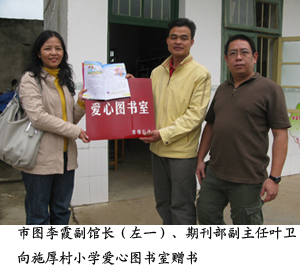 我校图书馆党支部表示,今后将每半年为新光村添置一批图书,使农家书屋能帮助农民朋友学到脱贫致富的本领,成为有文化、懂技术、会经营的新型农民。同时也希望孩子们能通过多读书更好的成长成才,将来为家乡、国家建设贡献自己的知识与智慧。