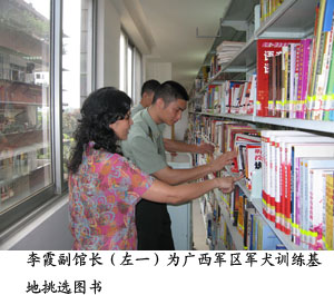 军事专业,为他们挑选了600多册图书及音像资料,为新增设的广西军区警犬训练队图书流通站送