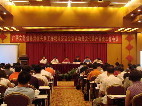 2007年8月20日,广西文化厅在南宁邕州饭店召开了广西文化信息资源共享工程现场交流会暨非物质文化遗产普查工作会议。来自全区各市、县(城区)文体局领导共150多人参加会议。广西文化厅副厅长陈映红、广西文化厅社文处副处长李为民、广西图书馆馆长徐欣禄、广西群众艺术馆馆长廖昆铭和广西民族艺术研究院院长廖明君等领导出席了会议并做了重要指示。我馆莫萍馆长、刘斌副馆长和技术部周明副主任代表南宁市图书馆作为大会经验介绍的单位参会。
