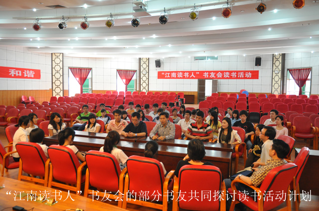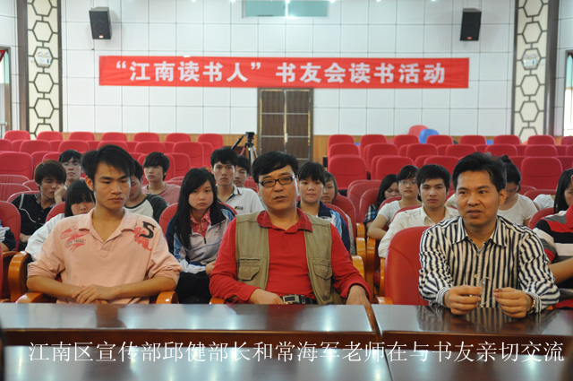 为了进一步倡导全民阅读,激发广大市民的学习兴趣,在社会大兴读书学习之风,以读书求新知,以读书促进步,以读书促和谐,同时也为了给热爱读书、热爱思考、乐意交流的读书者提供一个共同学习交流的平台,江南区文明办、江南区团委和江南区图书馆于3月11日组建了“江南读书人”书友会,计划每月举办一期“青年讲坛”,很快得到了众多读书爱好者的热情关注,并入会成为该会会员,队伍迅速壮大,其中既有已具有大专以上学历的公务员,也有企事业单位的职工,还有在校学生,分别来自清华大学、北京大学、中山大学等名校的9位博士也加入其中。