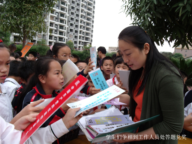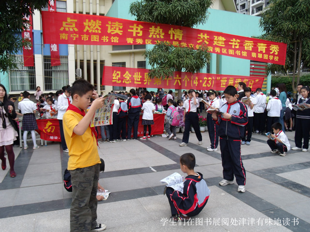 翡翠园学校依傍风景秀丽的青秀山,是凤岭新区第一所现代化的九年制公办学校,具有浓厚的阅读氛围和求知环境。当天,南宁市图书馆向该校赠送了200多本课外读物,受到学生们的热烈欢迎。在一个多小时的图书展阅中,数百名中、小学生纷纷抢阅他们喜爱的图书,或站在展览桌前,或在校园里席地而坐,津津有味的阅读起来。而有奖知识竞答的现场则更是热闹非凡,南宁市图书馆挂出的一百多条“喜迎建党90周年——党建知识有奖竞答题”以及“有奖猜谜”在几分钟内就被学生们抢答一空,争相拿着题目去兑奖,令我们的工作人员都应接不暇。此外,在签名立志的活动中,学生们纷纷在印着“让书香溢满青秀、让心灵徜徉书海”的横幅上签下自己的名字,并立下读书明志的远大志向。看到学生们好求知、爱读书的热情,我们深感赠书活动的价值。在活动现场,我们还将“南宁市图书馆简介”宣传折页发放给到场的家长,或通过学生带回给他们的家长,希望他们能到图书馆来享受更多的公益文化服务。今后,我馆还将继续举办“绿城讲坛”、“读书沙龙”、“走进社区”、“书香家庭”、“爱心赠书”、“关爱农民工”等一系列活动,希望市民们通过“书香绿城”读书月的活动,多多了解、关注图书馆,利用好图书馆,增加全民阅读活动在社会上的影响力,培育浓厚的读书风气。