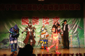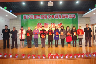 1月17日上午,“南宁市第三届青少年动漫系列活动”颁奖仪式在南宁市少年儿童图书馆举行。本次活动由南宁市文化新闻出版局、市科学技术协会和市教育局主办,市图书馆、市少儿图书馆、市中小学校外教育活动中心和广西哈虎网共同承办。获奖的各城区中小学近200名师生参加了颁奖仪式,市文化新闻出版局副局长桂文志,市教育局副局长刘彪以及市科学技术协会副主席吕力康等领导为获奖的同学和老师颁发了奖状和奖品。在颁奖仪式上,动漫爱好者上演了一场精彩的cosplay表演秀,逼真的造型和华美的服饰得到了参赛选手和动漫爱好者的热烈追捧。