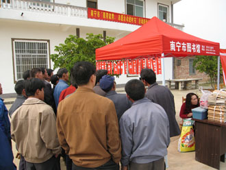 韦朝屯现有农户58户,人口276人,当天在该屯的灯光球场,法律志愿者开展了法律咨询服务;团市委开展志愿者登记活动、农技志愿者还深入田间地头给农民兄弟进行木薯、甘蔗等农技知识辅导讲座;我馆则推出了图书展阅、知识竞猜、科普图片宣传等服务项目,富有知识性、趣味性的活动内容吸引村民们,不一会我们的服务点就被村民们围了个水泄不通,同时我馆还与市新闻出版局分别组织一批图书帮助筹建该村的“农村书屋”,我馆的工作人员还耐心地指导村委们开展“农家书屋”的管理,着实让“能帮就帮·志愿服务在绿城”得到了很好的诠释。
