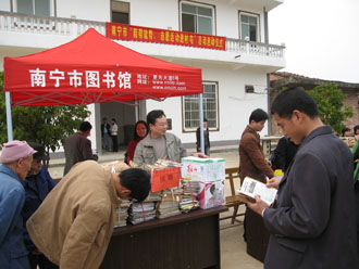 3月5日上午七点三十分,乘着和煦的春风,我馆一行五人前往武鸣县陆斡镇仁合村韦朝屯,参加在该村举行的“能帮就帮,志愿者活动进村屯”启动仪式,该项活动由南宁市精神文明办公室主办,市委宣传部副部长、市精神文明办主任冯力亲自参加了启动仪式,同时参加今天启动仪式的还有市卫生局、市新闻出版局、市司法局、团市委、市科协以及武鸣县民政局等单位。