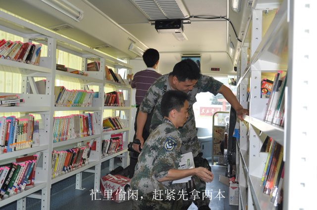 南宁市图书馆汽车图书馆自今年投入使用以来,充分利用图书馆的藏书优势,打破地域限制,多次开展“送书进军营”活动,主动将知识引入军营,让每个战士都能分享到浩瀚书海的芬芳馥郁;既实现了图书馆传播知识、传承文明的社会功能,又丰富了部队官兵的业余文化生活,为构建学习型军营发挥了积极作用。书籍不仅在南宁市图书馆与部队之间架起了知识的桥梁,更架起了友谊之桥。贺馆长表示,我馆将尽快落实与该部的流动图书馆建设,让书香常驻军营,共促军民文化和谐发展。