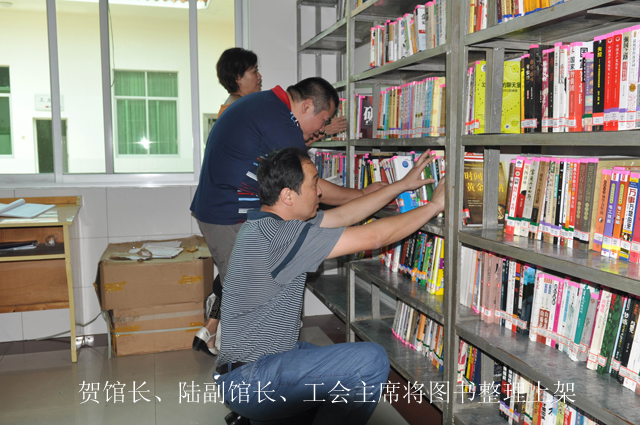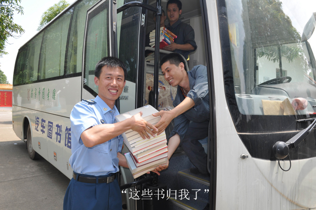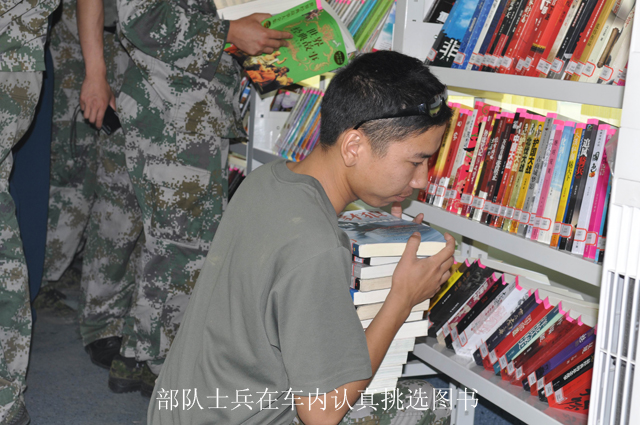 此行是我馆汽车图书馆继1月份为该部送书之后的第二次添书,车上的1080册图书均是根据官兵需要而精心挑选的新书籍。当满载书香的汽车驶进部队军营,首先映入眼帘的便是战士们站在烈日下牵着横幅翘首等待的身影。部队政治处王主任对我们的及时送书表示热烈欢迎和衷心感谢。根据部队需要,本批图书主要被分配到两个团队发放。战士们读书的热情犹如烈日般高涨,上千册图书很快即被搬空。随后,我们来到部队图书室参观,双方就图书室的建设交流了意见。为方便部队更好地查阅图书、利用书籍,贺南潮馆长还带领随行的图书馆工作人员将图书整理上架。