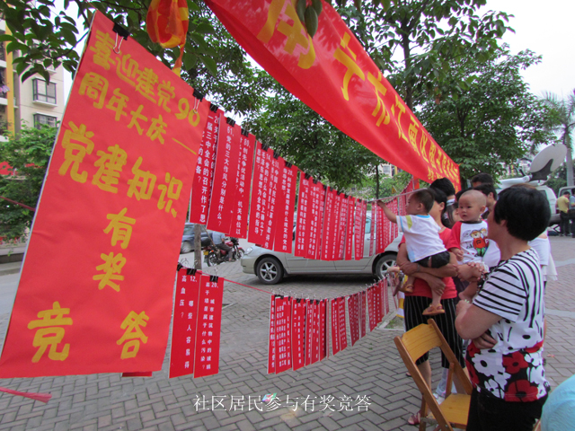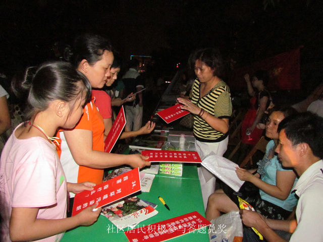 当天下午六点左右,南宁市图书馆的汽车图书馆和南宁市邮政局的流动邮政服务车“进驻”社区广场,面向广大农民工和社区居民展开现场阅读服务工作。同时,图书馆版报、科普版报宣传、农民工利用图书馆问卷调查和优秀报刊现场优惠征订送礼等系列活动也进行得如火如荼;同期进行的建党90周年知识、科普知识、创城知识竞答活动前更是人头攒动,南宁市富宁新兴苑工地的农民工及其家属和小区居民以及江南区二桥西社区和周边的居民都兴致勃勃地加入到竞答行列,从大家脸上的笑容和手上的礼品不难得知,建党90周年知识、科普知识和创城知识早已深入人心。