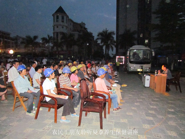 关爱农民工科学保健专题知识公益讲座于晚上七点整准时与广大农民工见面,应邀主讲的医学专家马标英老师为大家详细讲解了夏季养生保健的科学方法,并接受了农民工和居民们的现场咨询,进行了互动有礼活动。