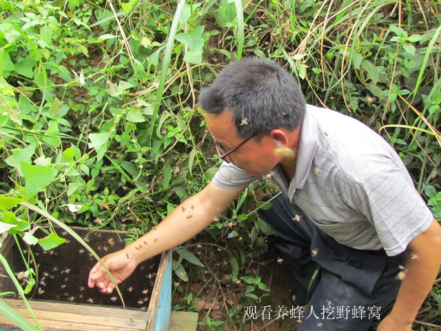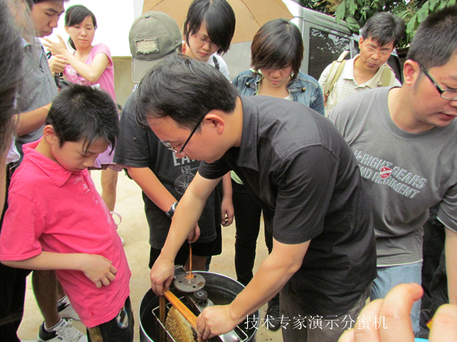 一到养蜂基地,孩子们的注意力就被一个个方形的蜂箱和旁边放置的一个大圆桶给吸引了。接着,养蜂场的技术专家从蜂箱里拿了一块蜂框为大家详细讲解了养蜂知识:蜜蜂的种类、分工、生长习性、不同的蜂巢以及怎样采集蜂蜜等等。在场的每一位成员都像听故事一样津津有味,还非常踊跃地向技术人员提问。技术专家幽默风趣的回答引得大家在会心一笑的同时对养蜂科技知识有了十分深刻而直观的印象。随后,技术人员向我们演示了采集蜂蜜的过程:先把蜂框上一层白色的结晶——蜂蜡铲掉,然后把蜂框放进大圆桶——分蜜机里,转动把手,机器利用离心力的原理,将蜂巢里储存的蜂蜜分离出来,经过过滤就成了天然可食用的美味蜂蜜了。孩子们对分蜜机充满好奇,纷纷体验了一回“摇”蜂蜜的乐趣。最让人紧张而期待的时刻,是技术专家带领我们下到一个小山谷里,看养蜂人挖野蜂窝。在这里我们见识了与养殖截然不同的纯白色的野生蜂巢以及蜂巢里比米粒更小的蜂卵,大家都觉得开阔了眼界,仿佛上了一堂生动而有趣的科普知识课。南宁市图书馆还给孩子们赠送了小笔记本,让他们边观察学习边做记录,提高作文写作的水平。