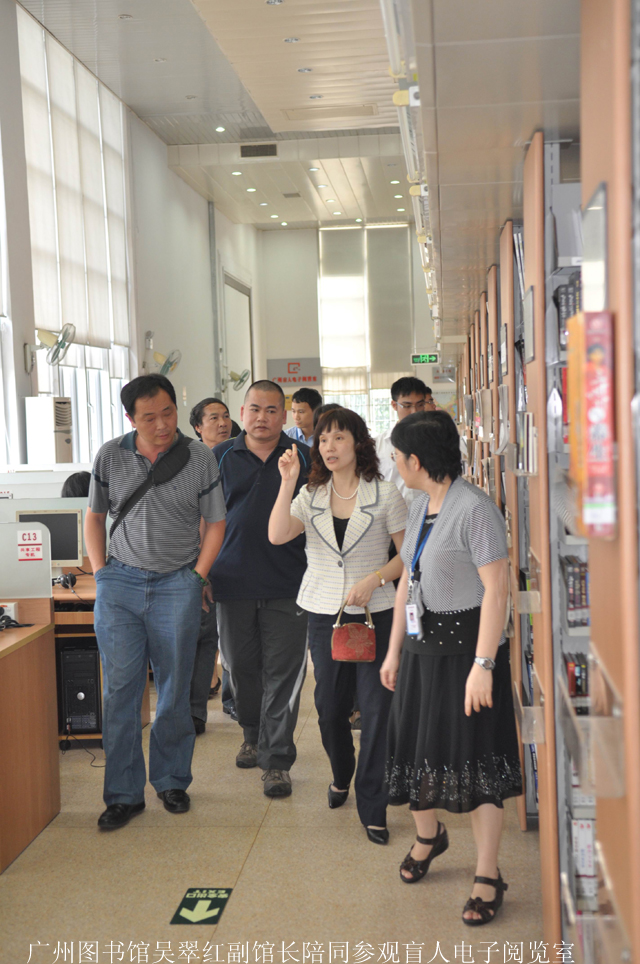 在广州图书馆,我们受到广州图书馆副馆长吴翠红、馆长助理王永东的热情接待。吴副馆长向我们详细介绍了广州地区总分馆建设的情况。目前,广州图书馆与城区图书馆基本上已实现了通借通还,并于2007年制定了《广州市社区图书馆服务体系2007-2010年建设方案—广州市公共图书馆城域网建设方案》。通过在社区、部队等建立分馆,有效提高了广州图书馆的覆盖率。该馆的盲人电子阅览室引起了我们的特别关注。早在2001年,广州图书馆就建成全国首个盲人专用电子阅览室。2004年,广州图书馆在场地非常紧缺的情况下,将盲人电子阅览室扩建到100平米,并添置音响视听设备及大量盲文点字图书,开展盲人专用电脑、有声读物浏览和点字图书外借等业务,为盲人实现共享社会文化成果提供了一个有效平台。我们还看到在每个盲文文献架上均配置盲文书标以便引导盲人读者找到所需文献,非常贴心。负责盲人电子阅览室的广州图书馆技术部陈主任向我们介绍,在今年的世界读书日活动中,广州图书馆还向盲人朋友推出了“数字移动阅读”的新的阅读服务。在数字移动阅读服务的数字移动阅读器里有全套的专用语音系统,增加了盲文凸点按键,视障人士可根据语音提示进行操作。盲人朋友还可以把数字移动阅读器借回家,阅读当天的5种报纸、70多种流行期刊和上千种电子图书,随时享受阅读的乐趣。