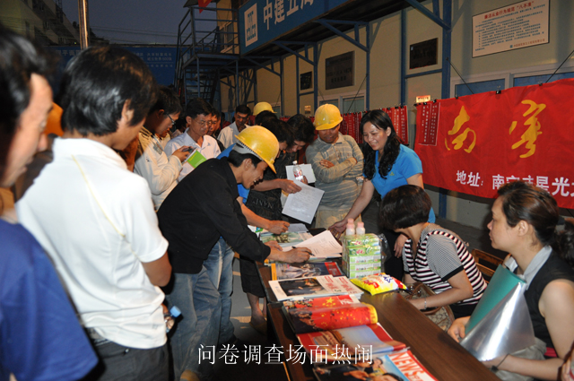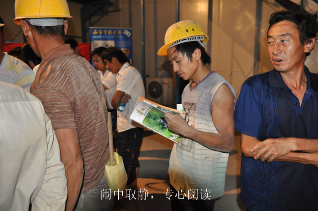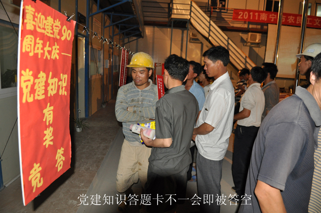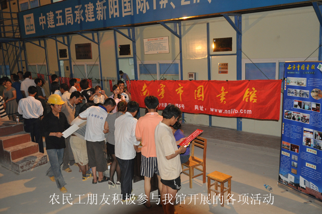 为丰富农民工文化生活,推进学习型社会建设,为建党90周年献礼,5月25日下午,南宁市总工会、南宁市图书馆与市疾控中心联合举办的“关爱农民工·知识送温暖”系列活动来到了第二站——南宁市新阳国际工地,让这里的农民工享受到免费的文化大餐。