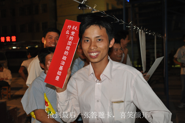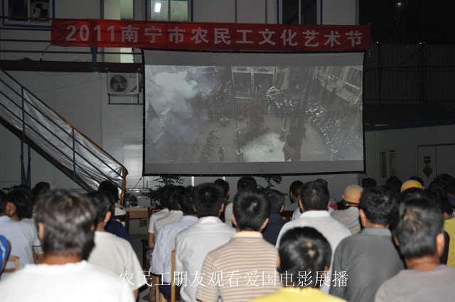 八点整,工地放起了爱国影片,大家抱着满满的礼品,继续享受文化大餐。