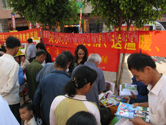 启动仪式9点钟开始,良庆区领导、市科技局领导分别做了重要讲话。一声“启动仪式现在开始”的话音刚落,各个活动摊位面前立即挤满了急于“求知”的农民伯伯们,他们有的在咨询西瓜的种植技术、有的在了解药用植物园工作人员带来的各种药材的药用价值、有的在我们摊位前翻看我们带去的各种精美书刊……在现场,一位小朋友捧着一本《少年科普世界》杂志津津有味地翻看,我们工作人员都被他那种爱学习的精神感动了,不由自主的拿出一整套《少年科普世界》赠送给他,小朋友激动地对我们说:“谢谢你们!有时间我一定到你们馆去‘充电’!”本次科普惠农活动,我们还专门为当地搜集了有关“西瓜、甘蔗种植”、“养猪、养鱼”等最新的科技信息,发放给现场的群众,受到了大家的欢迎,并给当地的文化站赠送200册期刊。