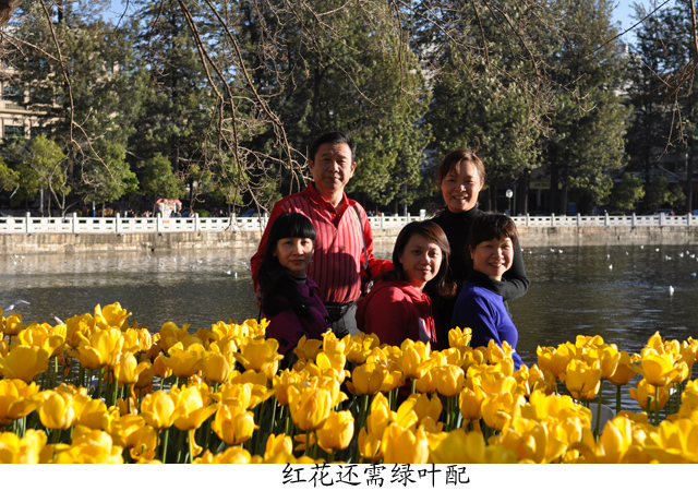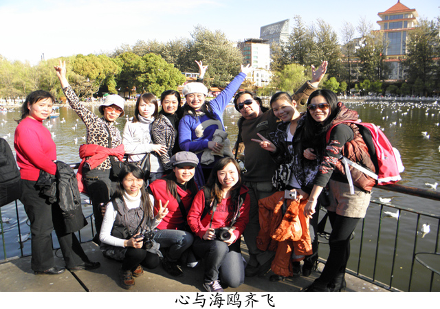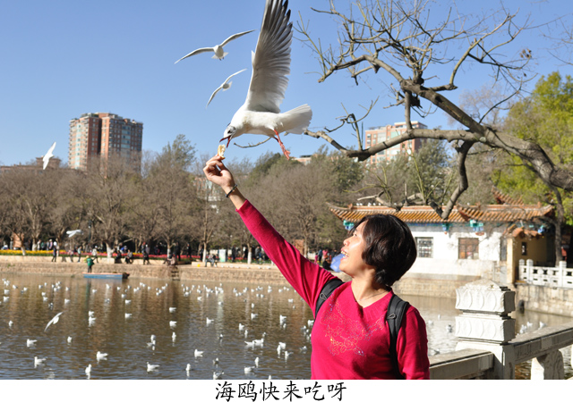 25日下午,依依不舍的离开漫山遍野的油菜花,经过三个多小时的车程,我们来到昆明的翠湖。从1985年开始,每年冬天有成千上万只西伯利亚红嘴鸥在翠湖越冬,从此年年必至,年复一年,至今已有22年光景。在高原的闹市中心,这一群从天而降的精灵,给昆明带来了生气,也给翠湖平添了奇景。我们一来到翠湖,见到湖中畅游着一只只红嘴、红爪、白底间灰羽毛的海鸥,碧蓝的天空中飞翔着一群群自由展翅的精灵,忍不住纷纷购买鸟食,或捏在手里、或抛向空中,或丢向水面,让海鸥嬉闹戏水,争抢食饵,给翠湖增添了无限热闹的情趣。湛蓝的天空、和熙的阳光、灵动的海鸥,伴随着游人的欢声笑语,人与自然构筑成一派欢乐详和的升平景象。