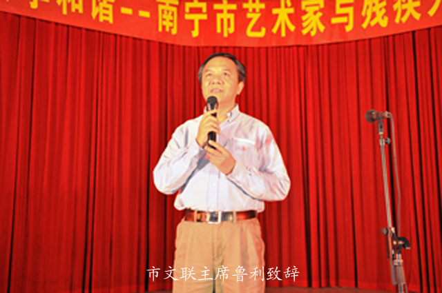 鲁利、张穗先分别致辞,陆坚、韦小海代表主办方向残疾人朋友赠送了历届民歌节以及文联出版的歌碟、音乐书等,希望残疾人能与健全人一起多多参与艺术活动、共享和谐艺术之美。
